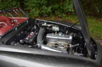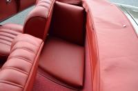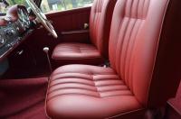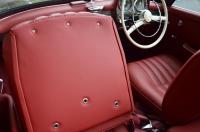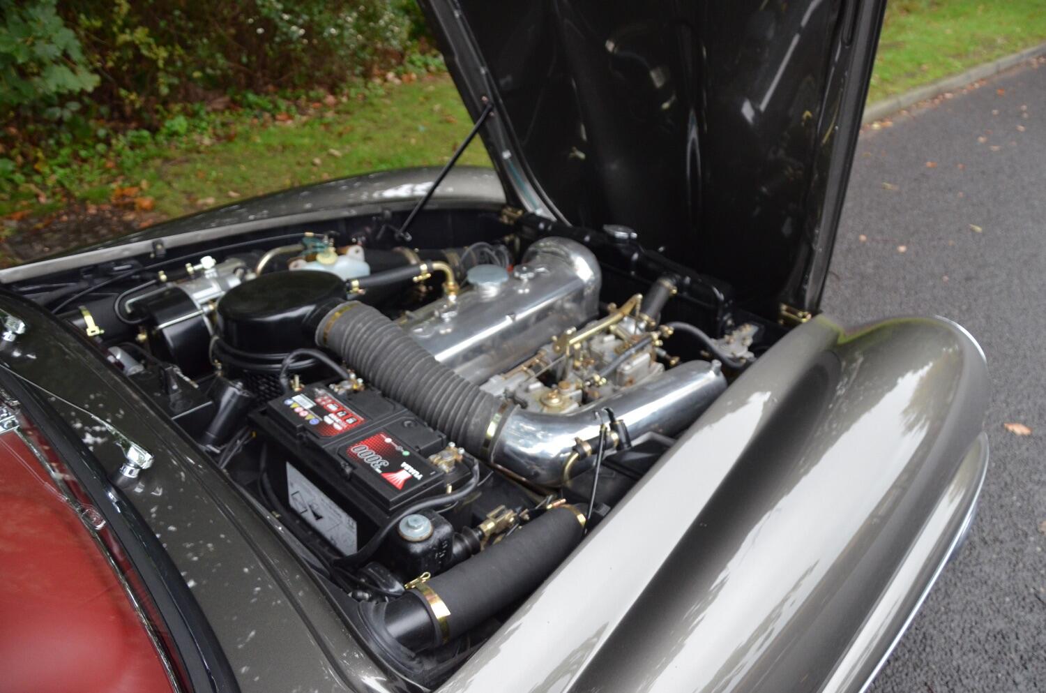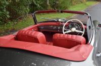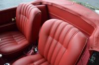This vehicle is adorned with Red Leather upholstery, complemented by matching carpets and a hood. Additionally, it includes a coordinated luggage set and a color-matched Grey Hard Top.
